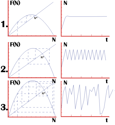 хаотические всплески (вспышки численности насекомых). Уравнения такого типа
