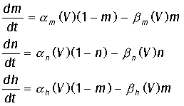 и составляет систему из четырех уравнений, известную как система Ходжкина-Хаксли (1952). Она рассчитывается численно и