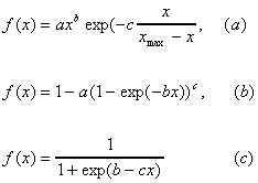 Частной функцией отклика показателя или процесса называют функцию зависимости значений этого показателя от одного экологического фактора, то есть функцию одной переменной fj(xj). Примеры частных функций отклика скорости роста растения на изменение внешних факторов приведены на рис. 5. Обобщенной функцией Fk называется функция зависимости значений k -го показателя или процесса от всех рассматриваемых экологических факторов, представленная как комбинация частных функций отклика.. В зависимости от постановки задачи в качестве обобщенной функции отклика может выступать суммарная биомасса экосистемы или отдельного вида, урожай или такие обобщенные характеристики как функция (индекс) благополучия системы, функция резистентности, функция модификации и другие.
