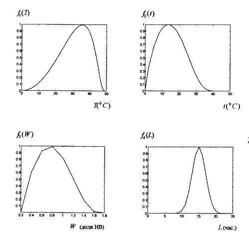 ![]() Рис.5. Вид частных функций отклика скорости развития растения сои в период между всходами и бутонизацией. T - максимальная суточная температура воздуха (град. С), t - минимальная суточная температура воздуха, W - влажность почвы, L - продолжительность светового дня (час.) |
