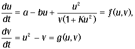 a, b, K - константы. Модель описывает автокаталитическую продукцию активатора u - член u2 / [v(1 + K u2)] - с учетом насыщения до величины 1 / (Kv) при больших u. Ингибитор v активируется с увеличением u в соответствии со вторым уравнением, но ингибирует производство активатора.