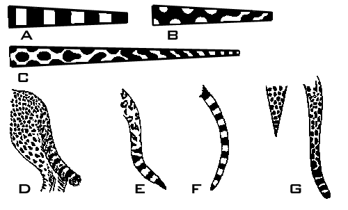 Детализация моделей типа (32-33) позволила описать процессы распространения волн в сердечной мышце, образование пятен планктона в океане (Malchow, Медвинский), модели образования стационарных во времени и неоднородных в пространстве структур "pattern formation", в том числе модели окраски шкур животных, подробно описаны в монографиях Д.Марри "Нелинейные дифференциальные уравнения в биологии. Лекции о моделях", М., Мир, 1983 (J.D.Murray. "Lectures on Nonlinear Differential Equation", Oxford, 1977), J. D. Murray "Mathematical Biology", Springer, 1989, 1993. [. Окраски типа "шкуры леопарда" образуется в системе реакция-диффузия, локальное взаимодействие которой описывается механизмами, подобными механизмам Жакоба и Моно (Модель Чернавского [). Широко известна модель, описывающая дифференциировку клеток гидры (Girer, Mainhardt, 1972). Локальная безразмерная модель имеет вид: