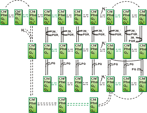 Цитохромный комплекс и комплекс фотосистемы 1 также характеризуются набором большого числа состояний. Модель, описывающая, кроме того, взаимодействие между комплексами, ионные потоки, работу АТФ-синтетазы, содержит десятки уравнений и сотни параметров, многие из которых известны из литературы. Однако эти параметры оценены для разных объектов и при разных условиях, чаще всего их оценивают в экспериментах на выделенных фрагментах, элементарные константы скоростей реакций для которых могут быть иными, чем для целых хлоропластов. Поэтому при включении в модель величины параметров, как правило, требуют уточнения.
