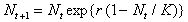 Функция такого типа может быть описана с помощью различных формул. Ниболее широко распространена версия дискретного логистического уравнения, предложенная Мораном для численности насекомых (1950) и Рикером для рыбных популяций (1954):