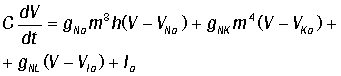 где V - потенциал, INa, IK, IL - соответственно натриевый, калиевый токи и ток