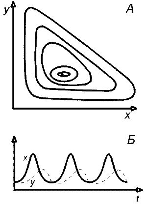 ![]() Рис.8. Модель Вольтерра хищник-жертва. А. Фазовый портрет. Б. Зависимость численности жертвы и хищника от времени. |
