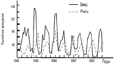 ![]() Рис.9. Кривые численности зайца и рыси в Канаде по данным пушных компаний. (Вилли, Детье, 1974) |
